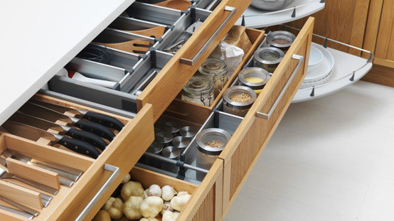 廚房里總有一些拐角讓人心煩,但其實只要設計得當,也能成為收納好幫手。比如櫥柜的拐角處儲藏空間很大,常常被忽略,因為里面太深了。對于這種空間可以安裝一些“小怪物”,也就是旋轉(zhuǎn)型的櫥柜五金,把里面的東西旋轉(zhuǎn)出來,這樣就不會浪費任何死角了。