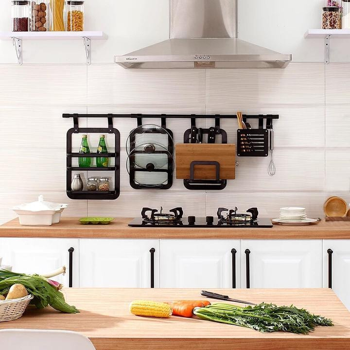 墻上空間可以利用起來,把一些使用頻率高的小物件掛在墻上,取用也更方便??曜?、勺子、鍋鏟、刀具、烹飪小工具……這些東西放的深了不便于隨時取用,攤在明面上又太亂太占地方,買各種掛鉤把它們掛上墻、貼上墻,都是好主意。