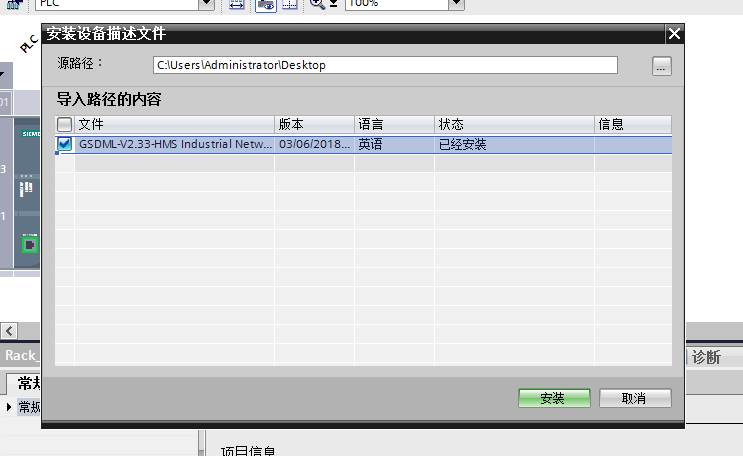 在彈出的對(duì)話窗口的右上方點(diǎn)擊“…”按鍵,彈出文件路徑選擇窗口后,在此窗口選擇GSDML文件存放的路徑。選擇完畢后,軟件會(huì)自動(dòng)搜索此目錄下的GSDML文件。當(dāng)軟件搜索到GSDML文件后,會(huì)顯示在列表欄中,勾選列表欄中GSDML文件的選擇欄后,點(diǎn)擊“安裝”按鈕完成GSDML文件安裝。