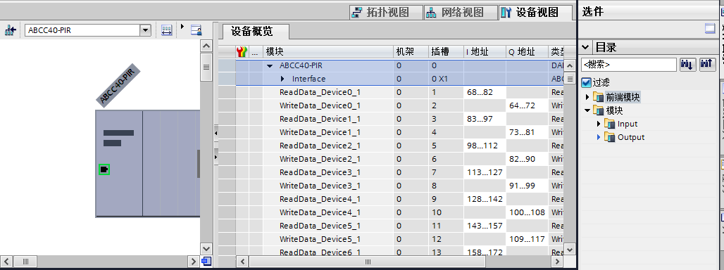 雙擊虛擬總線控制器設(shè)備,打開“設(shè)備視圖”,在右側(cè)的目錄中打開Input子目錄,添加總線控制器CAN網(wǎng)絡(luò)下所有受控從站及網(wǎng)絡(luò)分組的上行數(shù)據(jù)塊。添加完畢后,打開Output子目錄,添加總線控制器CAN網(wǎng)絡(luò)下所有受控從站及網(wǎng)絡(luò)分組的下行數(shù)據(jù)塊。雙擊所選數(shù)據(jù)塊,即可完成添加。